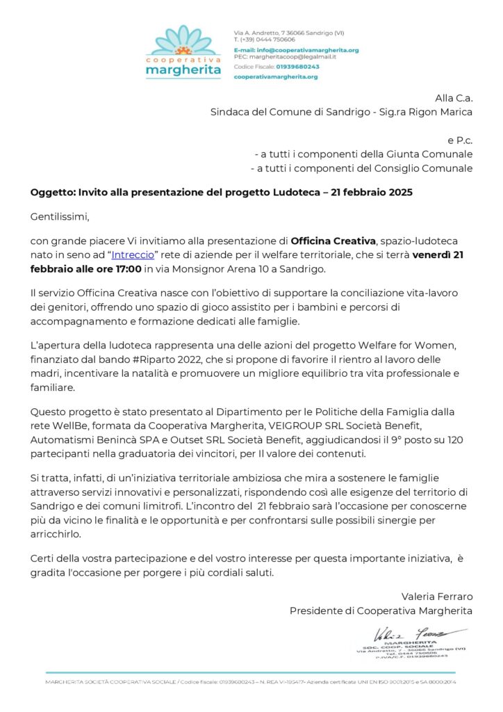Venerdi 21 febbraio alle ore 17 Presentazione del Progetto Ludoteca alle Amministrazioni di otto Comuni limitrofi a Sandrigo, ai dirigenti scolastici e al Comitato Genitori.